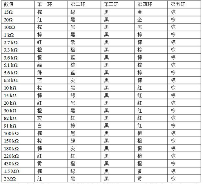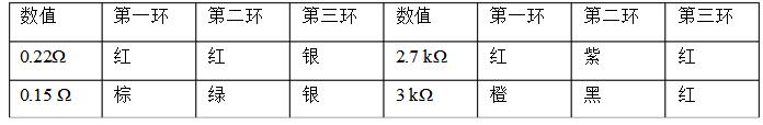 技巧2:棕色環是否是誤差標志的判別。棕色環既常用做誤差環,又常作為有效數字環,且常常在第一環和最末一環中同時出現,使人很難識別誰是第一環。在實踐中,可以按照色環之間的間隔加以判別:比如對于一個五道色環的電阻而言,第五環和第四環之間的間隔比第一環和第二環之間的間隔要寬一些,據此可判定色環的排列順序。