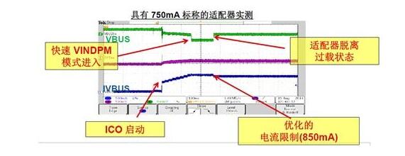 其次,能夠實現97%的效率得益于TI獨特的ICO算法,ICO能夠實時檢測適配器的電流能力大小。文司華博士做了詳細解釋,“如上圖所示,這是我們的VBus,當接入電池后發生了一些變化。接入電池后就開始充電了,作為ICO模式,作為比較小的電流去測,比如500毫安開始啟動了,在500毫安時適配器很舒服地進行工作,當電流逐漸上調了以后,我們會發現Bus電壓突然掉下來了,它能掉下來并且保持在這個模式下,VEDPM模式啟動了,在這個模式里,適配器實際上已經過載了,由于VEDPM功能的保護,適配器雖然過載但還能工作,因此這個點能夠保持,但這不是最理想的狀況,原因是它讓適配器過載了,適配器會發燙的,最好的處理辦法是讓適配器能夠脫離這個狀態,ICO功能能夠讓電流再退回一點,等它退回一點,這個適配器就脫離過載狀態了。”