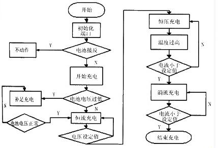 上電后,單片機首先檢查電池是否接反,電池電壓是否因為電而過低,如果電壓過低,先使用小電流給電池充電一間,使電壓達到三階段充電常水平在開始充電,如果電常則直接進入正常充電階首先是恒流充電階段,充電小于0.5 C,一般取0.1 C,電壓會緩慢的上升,當(dāng)電壓到一定階段(本例中采用電60V)改為恒壓充電,此時隨電過程的進行電池內(nèi)阻會逐升,充電電流會隨著內(nèi)阻的而減小,當(dāng)單片機檢測電流減小到一定的值(小于恒流充電值的1/1 0),立即轉(zhuǎn)入涓流充電階段,充電電流一般取0.3C,在此階段電池電壓會減小,當(dāng)充電電流小于0.0 1 C時即可認(rèn)為電池已充滿,單片機會自動將電池從充電電路中切除。在恒壓階段如果單片機檢測到電池溫度高于45度則自動轉(zhuǎn)入第三階段,待溫度下降后再轉(zhuǎn)入第二階段。充滿后通過單片機關(guān)斷繼電器,停止充電.。